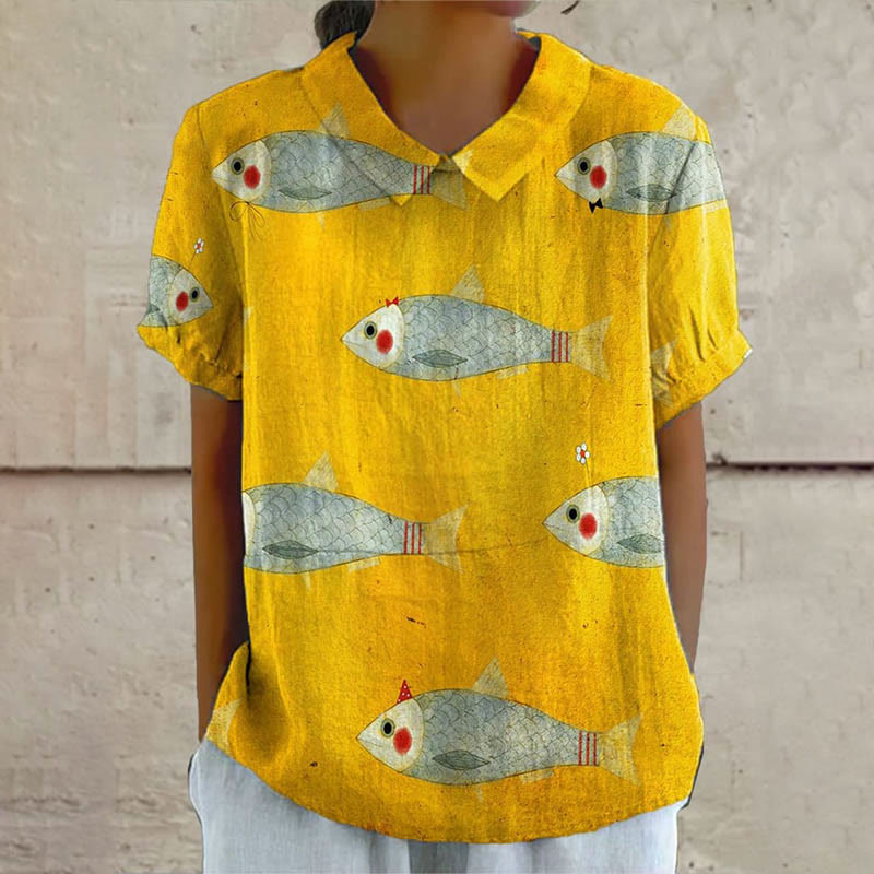 Dashingsoul Women's Japanese Style Cute Little Clownfish Art Print Casual Lapel Loose Blouse