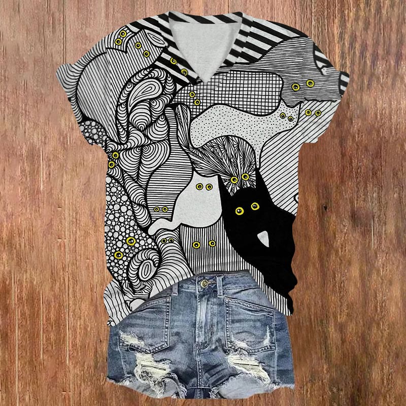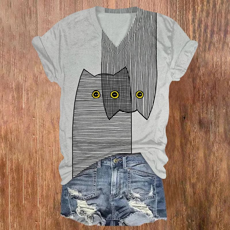 Dashingsoul Creative Overlapping Lined Upside Down Cats With Yellow Eyes Art Print V-neck T-shirt