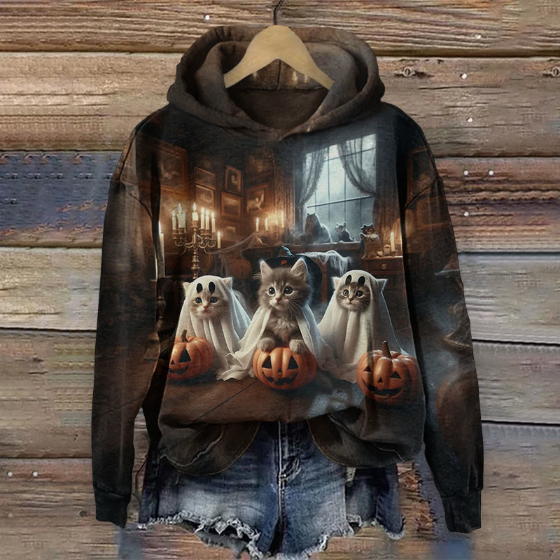 Dashingsoul Halloween Cute Ghost Cat Print Casual Long Sleeve Hoodie