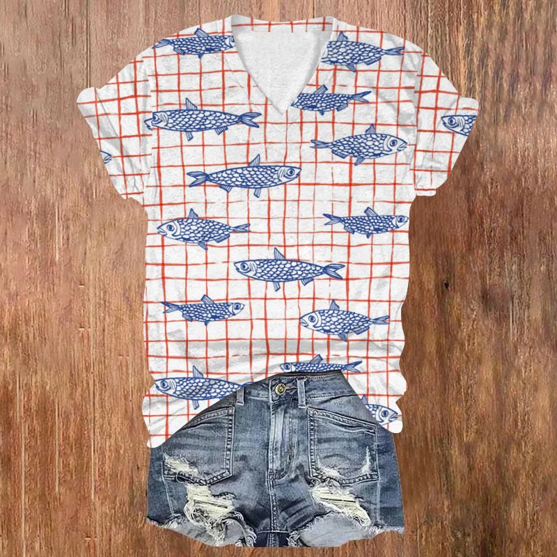 Dashingsoul Creative Checkered Fish Art Print V-neck T-shirt