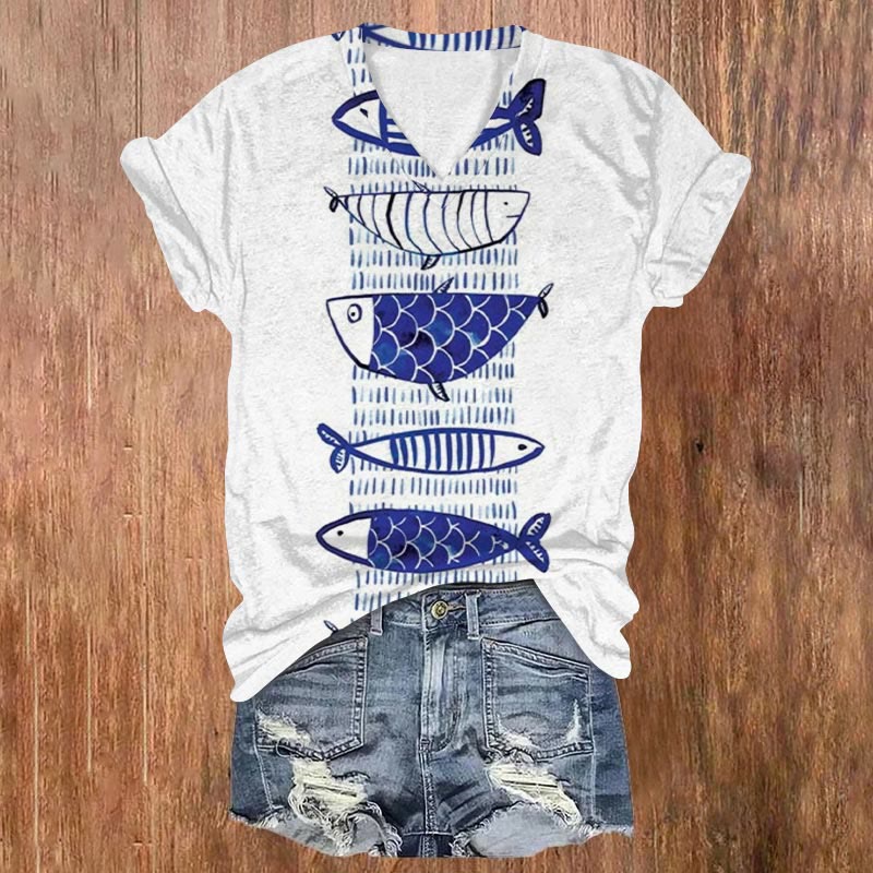 Dashingsoul Women's Creative Simple Line Fish Art Print V-neck T-shirt