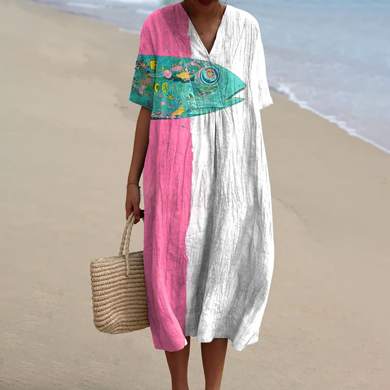 Women's Creative Floral Fish Splicing Color Art Print Short-sleeved Midi Dress