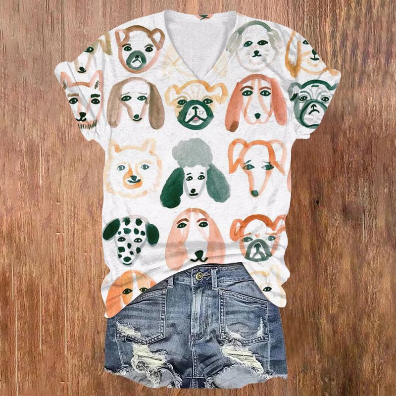Dashingsoul Colorful Doodle Puppies Print V-neck T-shirt