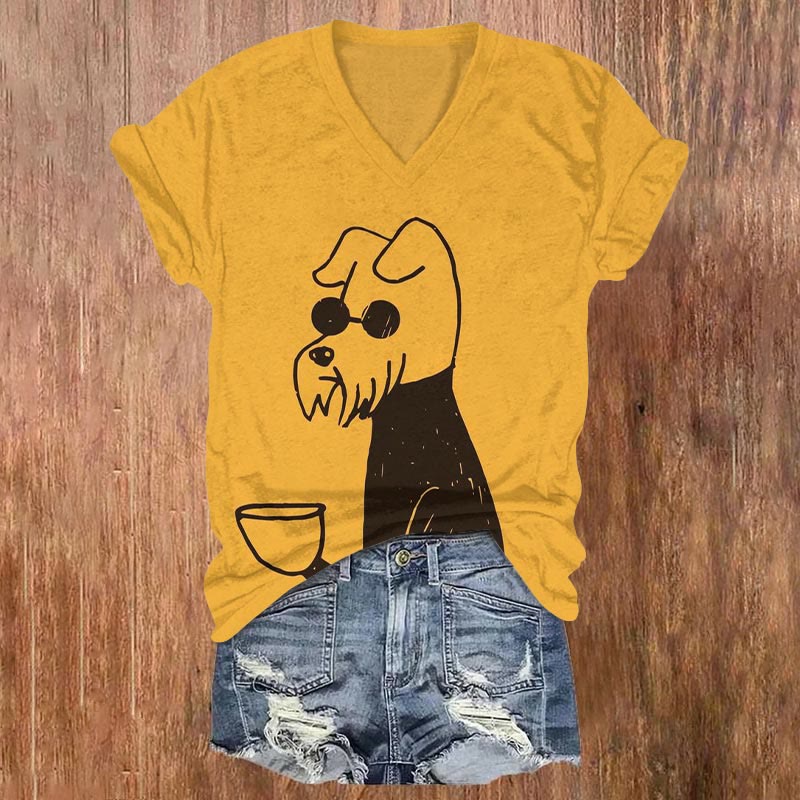 Dashingsoul Puppy In Sunglasses Drinking Coffee Print V-neck T-shirt