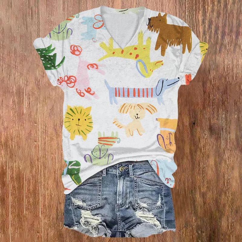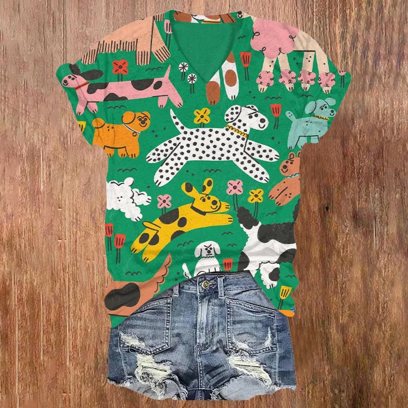 Dashingsoul Doodle Hand Drawn Puppies Print V-neck T-shirt