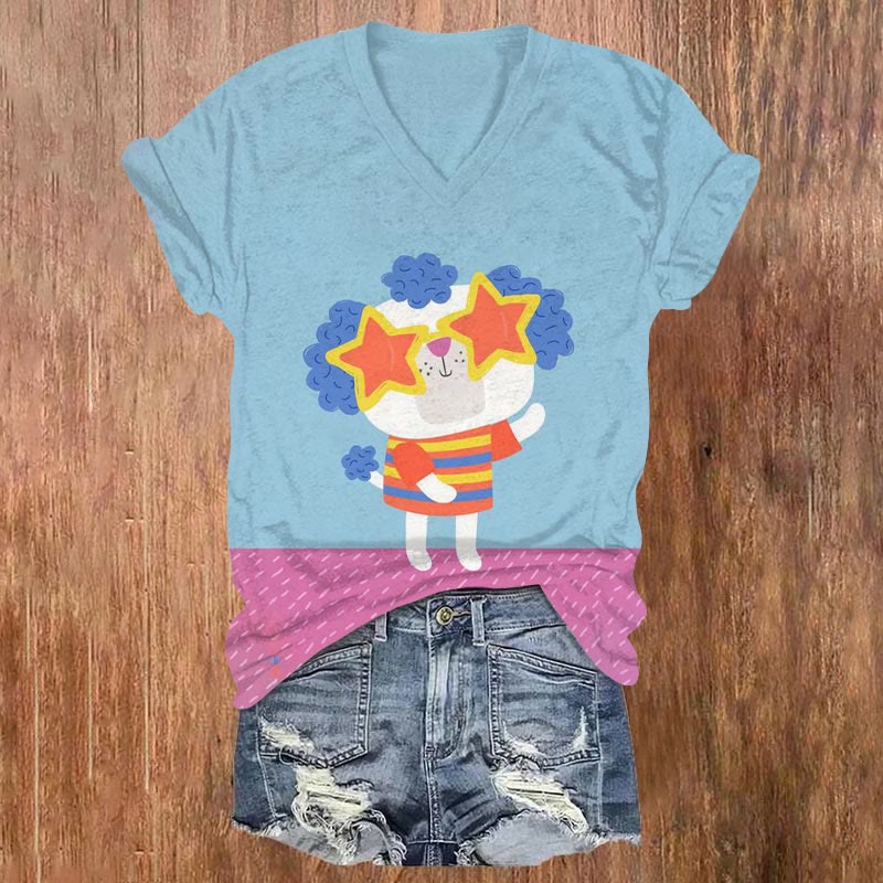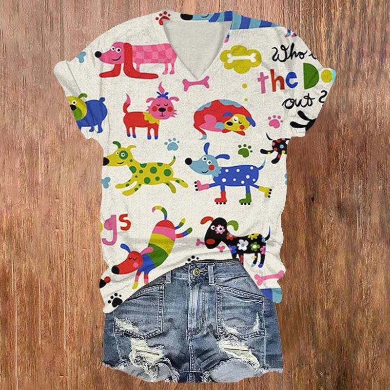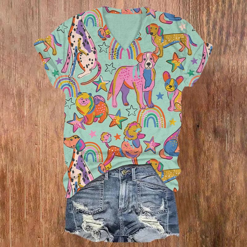 Dashingsoul Rainbow Puppies Print V-neck T-shirt