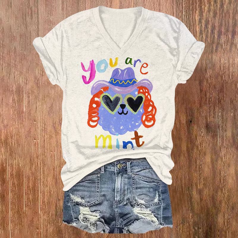 Dashingsoul You Are Mint Puppy Print V-neck T-shirt