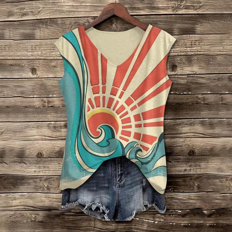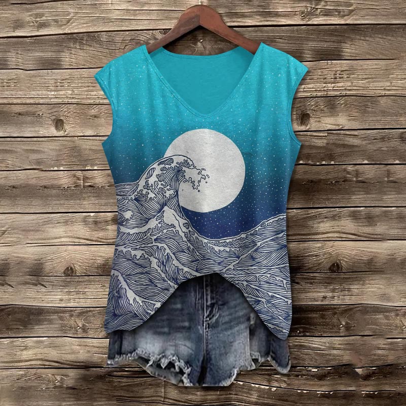 Dashingsoul Vintage Sea Waves Art Print V-neck Tank Top