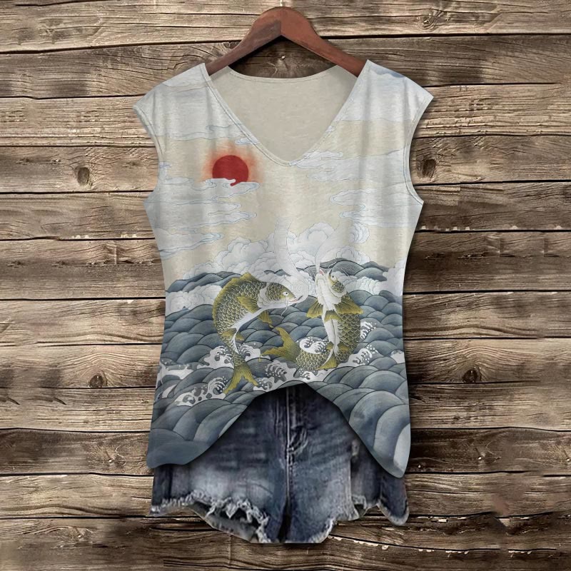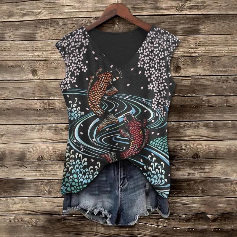 Dashingsoul Japanese Wave Carp Flower Art Print V-neck Tank Top