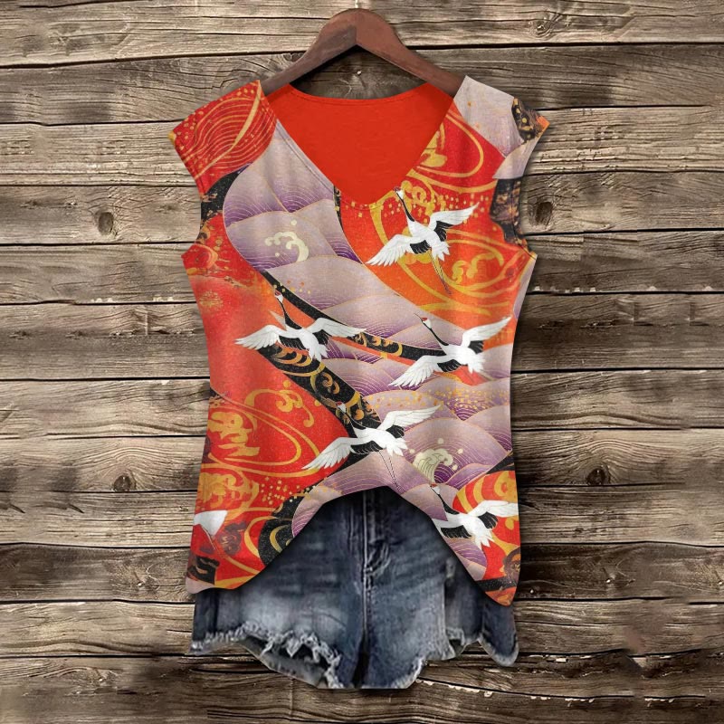 Dashingsoul Japanese Ancient Wave Crane Art Print V-neck Tank Top