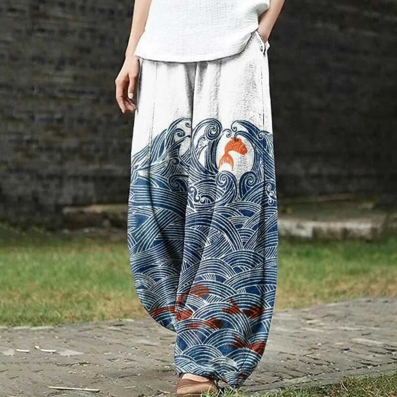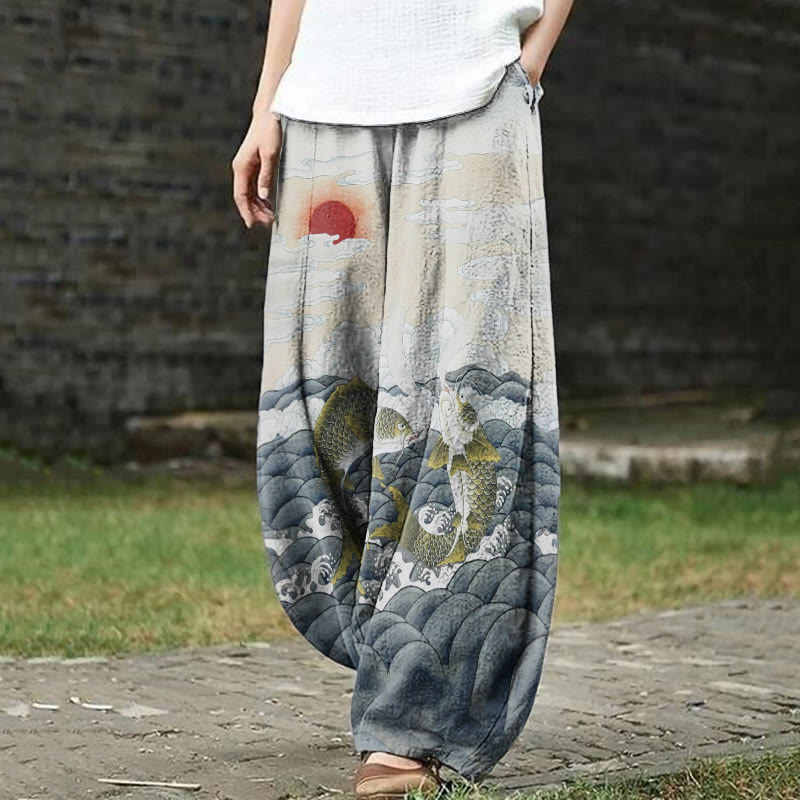 Dashingsoul Japanese Style Wave Carp Line Art Print Casual Pants