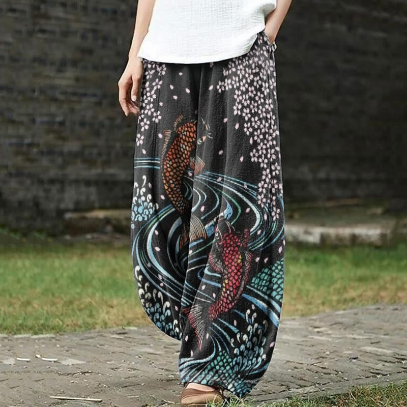 Dashingsoul Japanese Wave Carp Flower Art Print Casual Pants