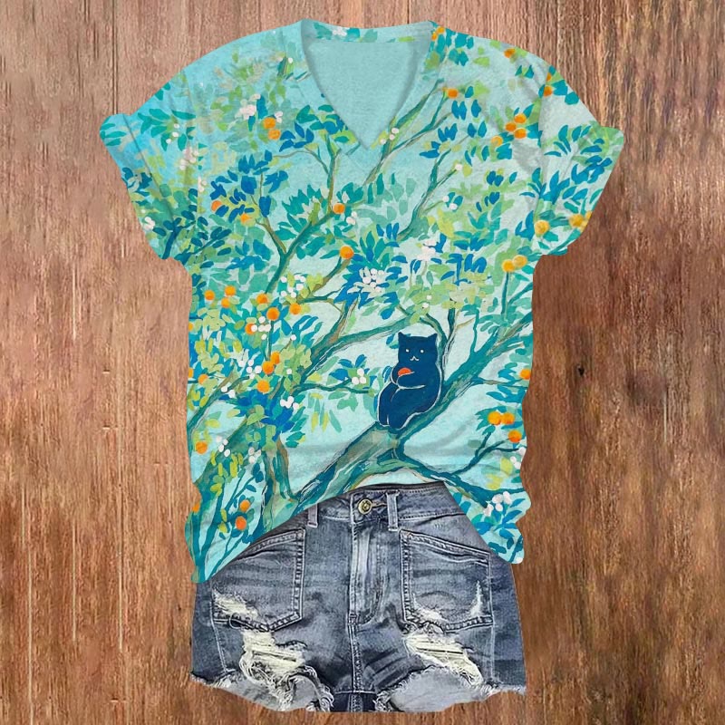 Dashingsoul Cute Black Cat On Orange Tree Print V-neck T-shirt