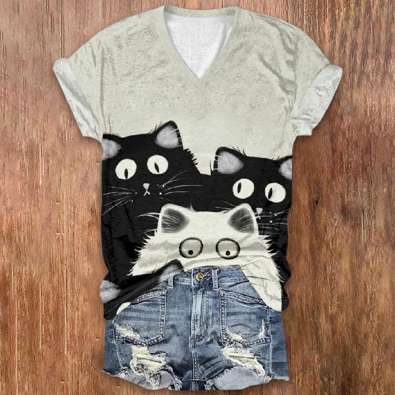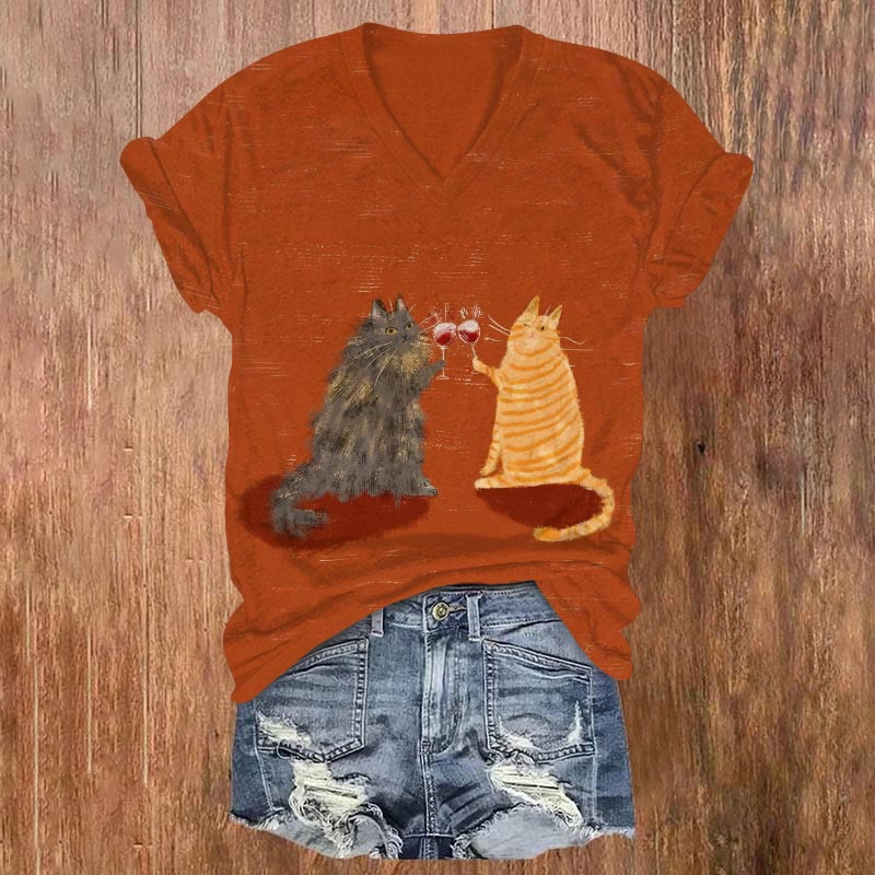 Dashingsoul Cheers Cat Friends Print V-neck T-shirt