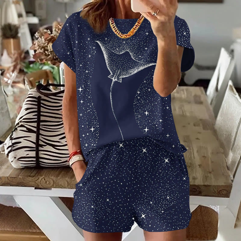 Dashingsoul Starry Spotted Eagle Rays Print Casual Short Sleeve T-shirt Set