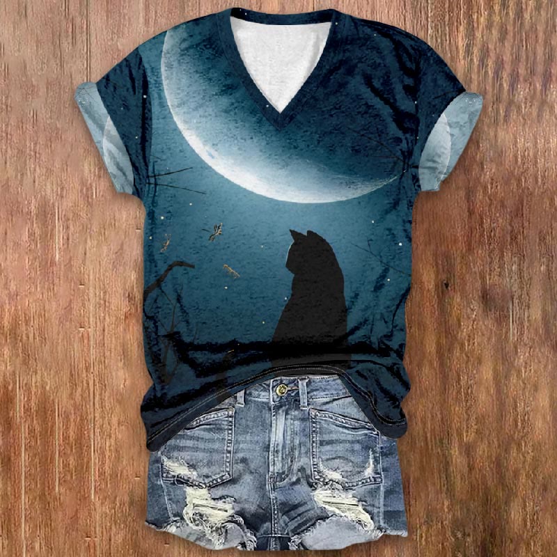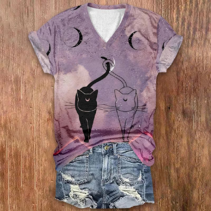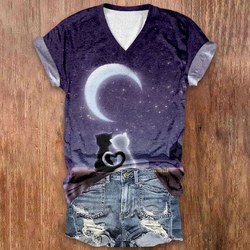 Dashingsoul Loving Cats With The Moon Print V-neck T-shirt