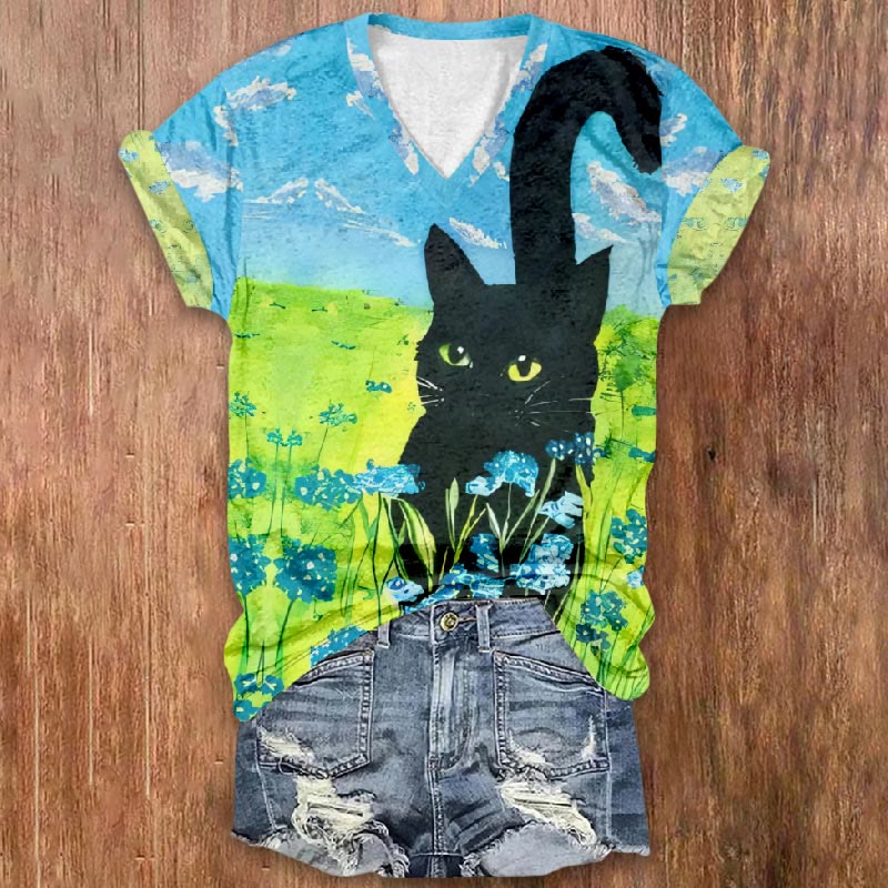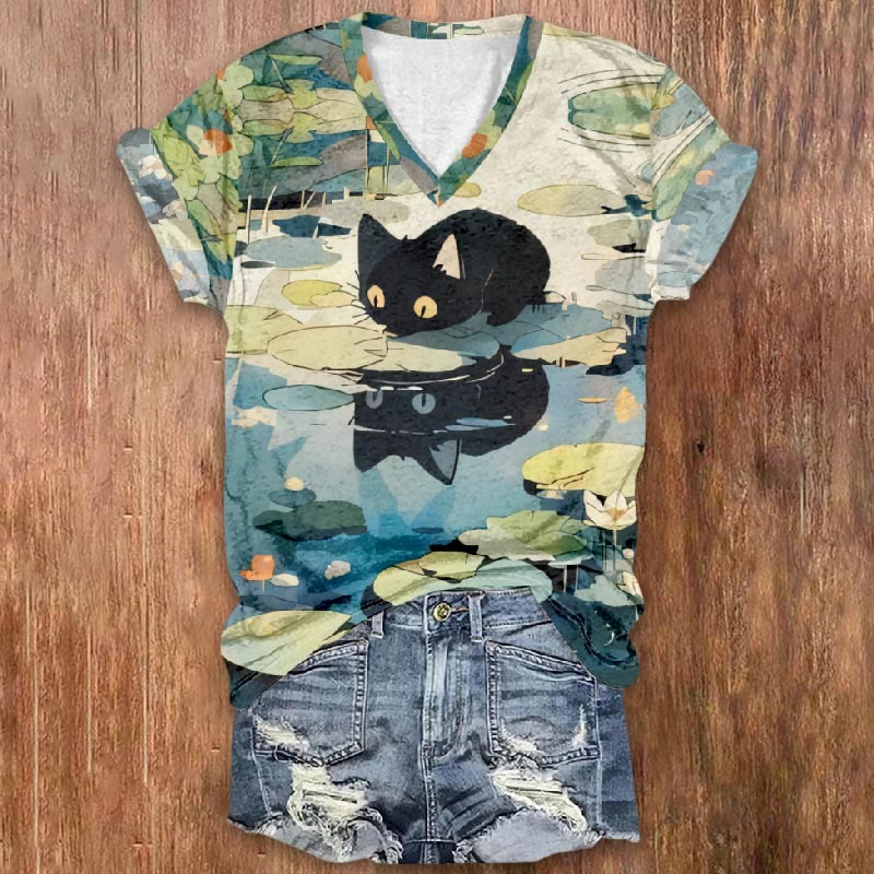 Dashingsoul A Black Cat Playing By The Lake Print V-neck T-shirt