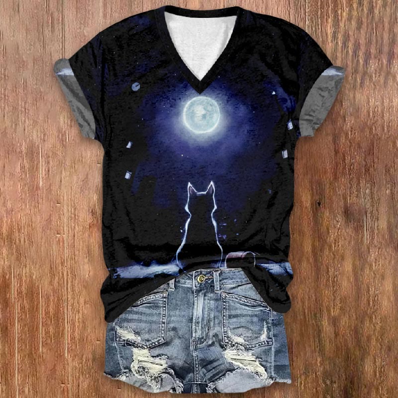 Dashingsoul Kitten Looking Up At The Moon Print V-neck T-shirt