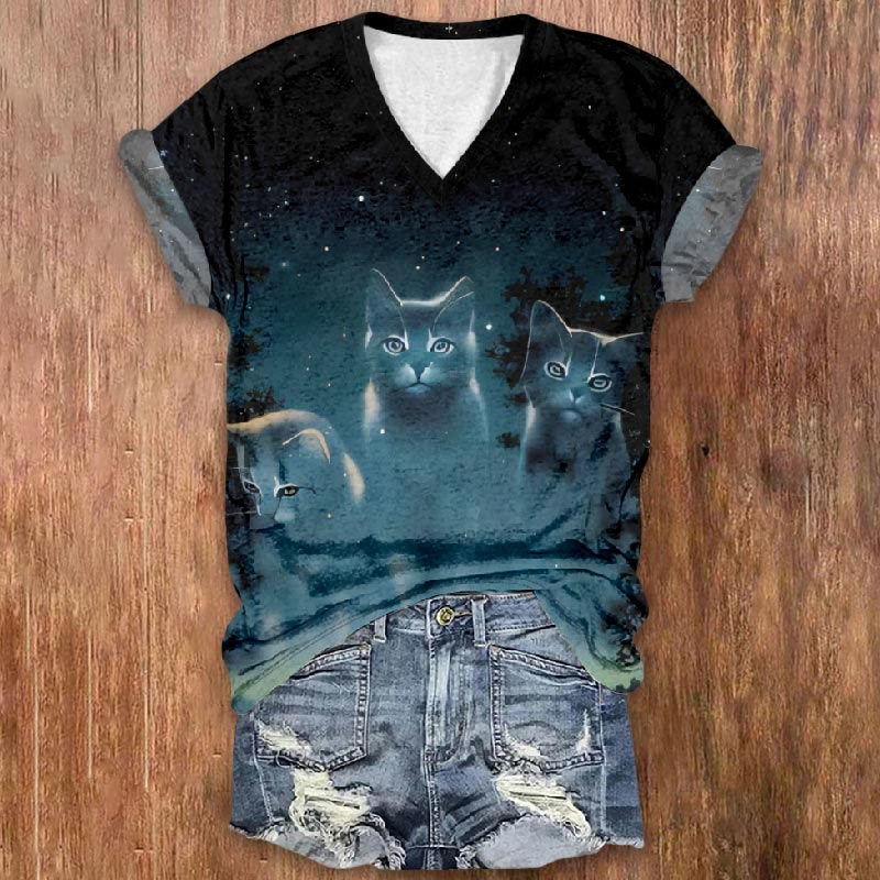 Dashingsoul Cats Gazing At The Night Sky Print V-neck T-shirt