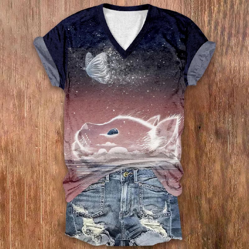 Dashingsoul Lovely Cat With Flying Butterfly Print V-neck T-shirt