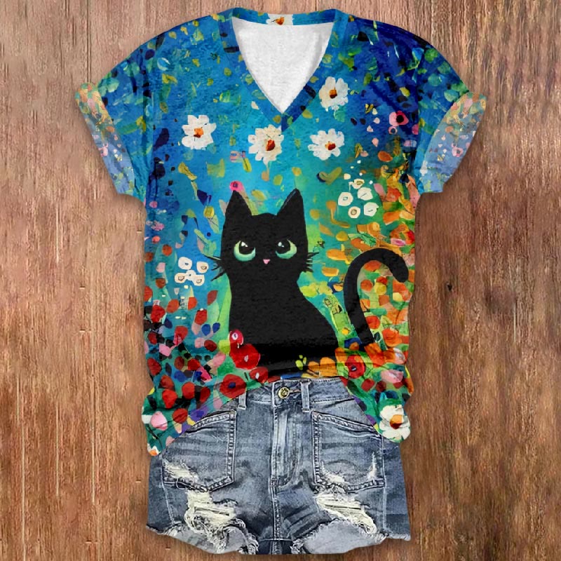Dashingsoul Lovely Cat Surrounded By Colorful Flowers Print V-neck T-shirt