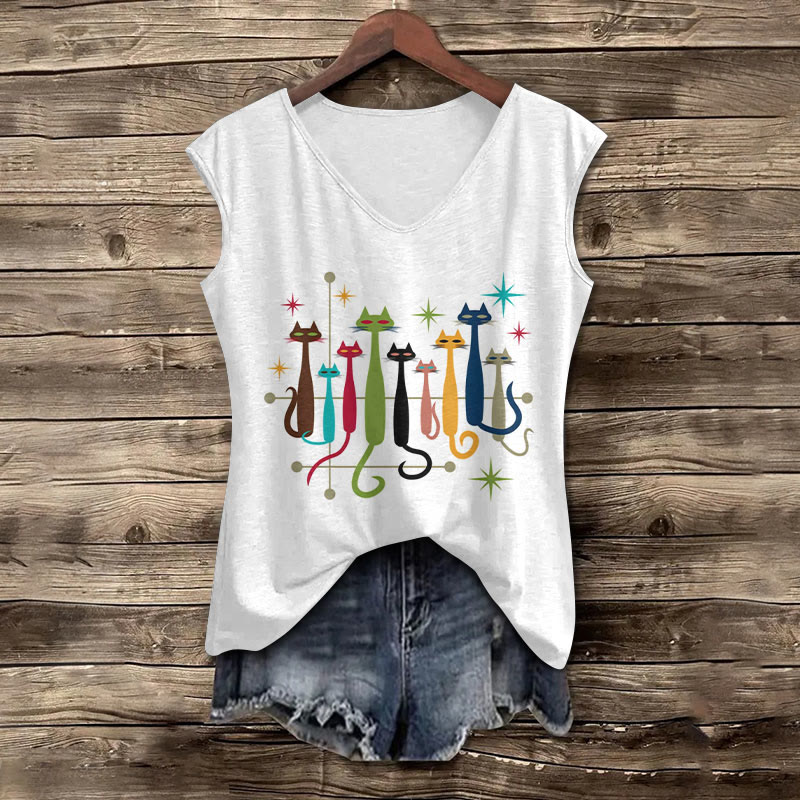 Dashingsoul Retro Cat Print V-neck Tank Top