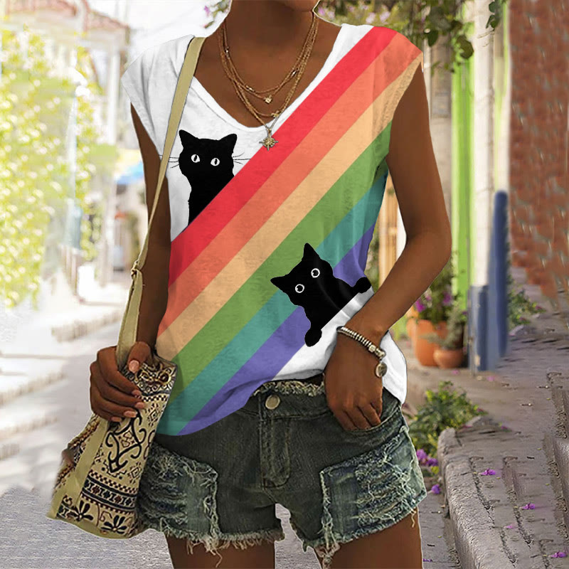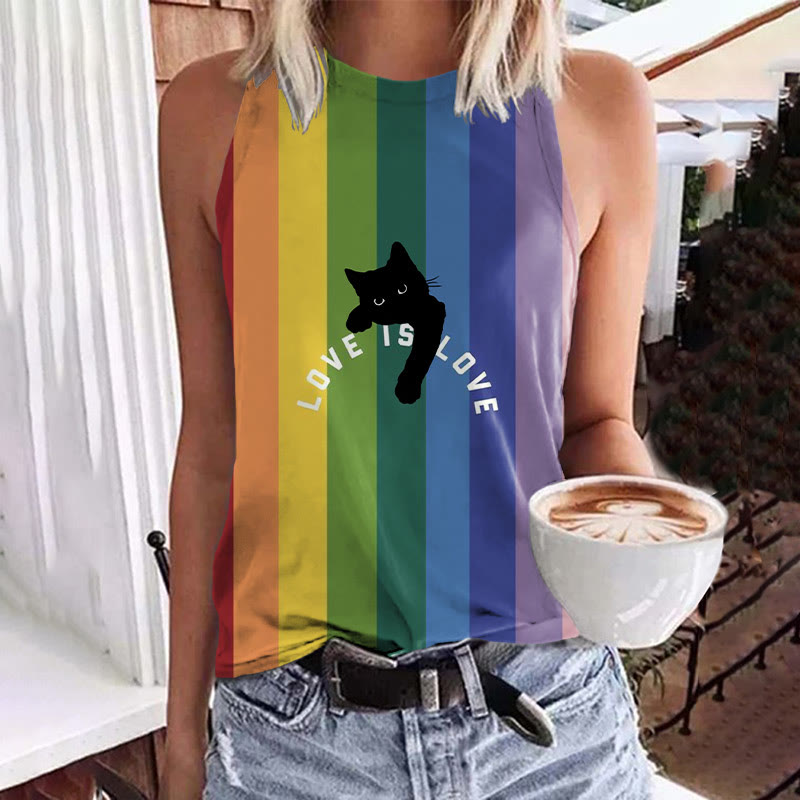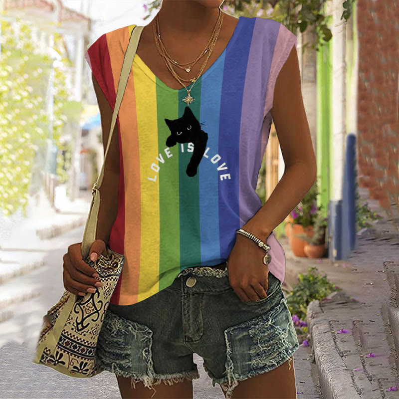 Dashingsoul Love Is Love Rainbow Black Cat Print V-neck Tank Top