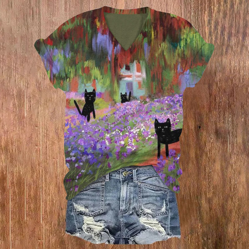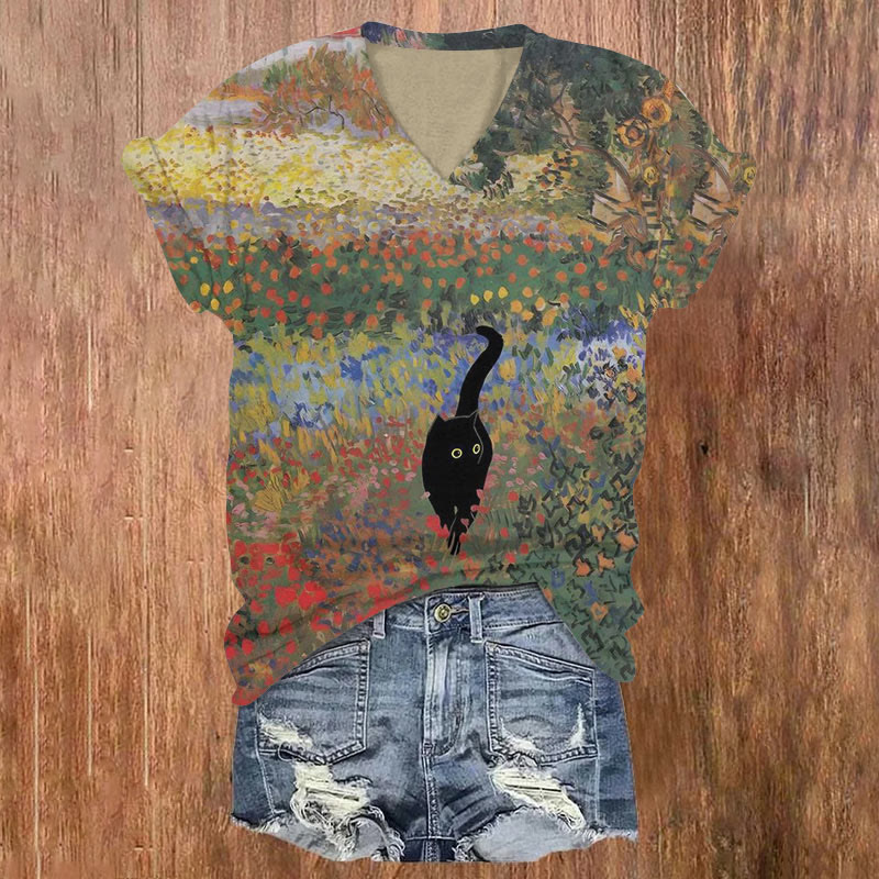 Dashingsoul Black Cat Walking In The Flowers Oil Painting Print V-neck T-shirt