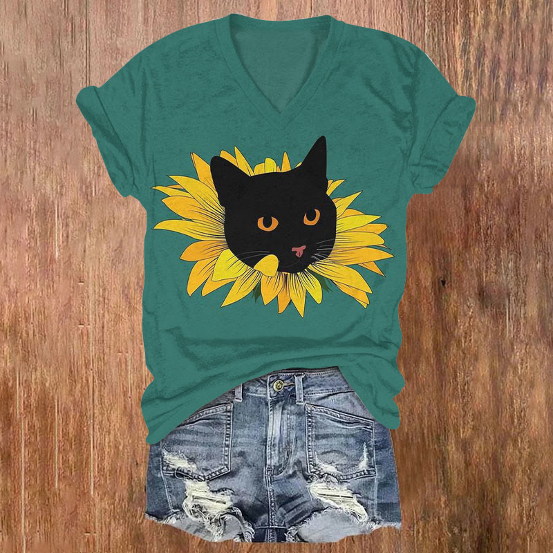 Dashingsoul Sunflower And Black Cat Oil Painting Print V-neck T-shirt