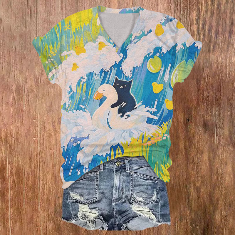 Dashingsoul Black Cat Riding A Duck Oil Painting Print V-neck T-shirt