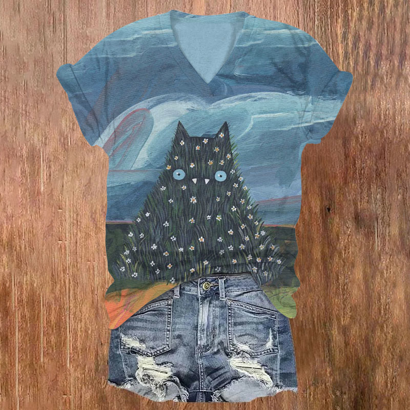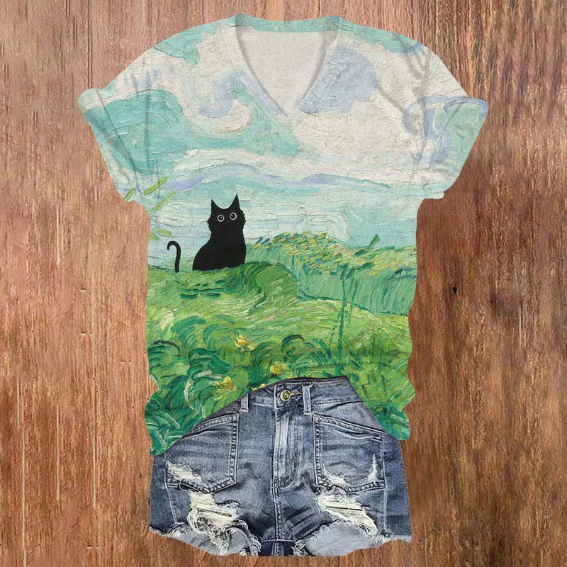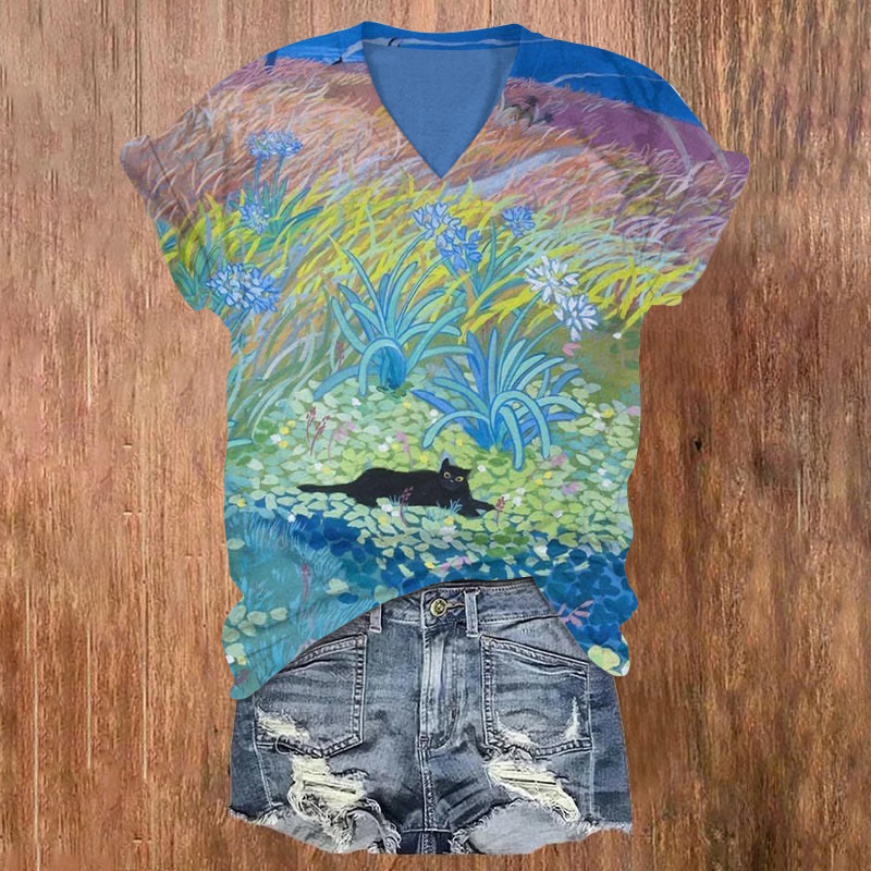 Dashingsoul Black Cat In The Grassland Oil Painting Print V-neck T-shirt