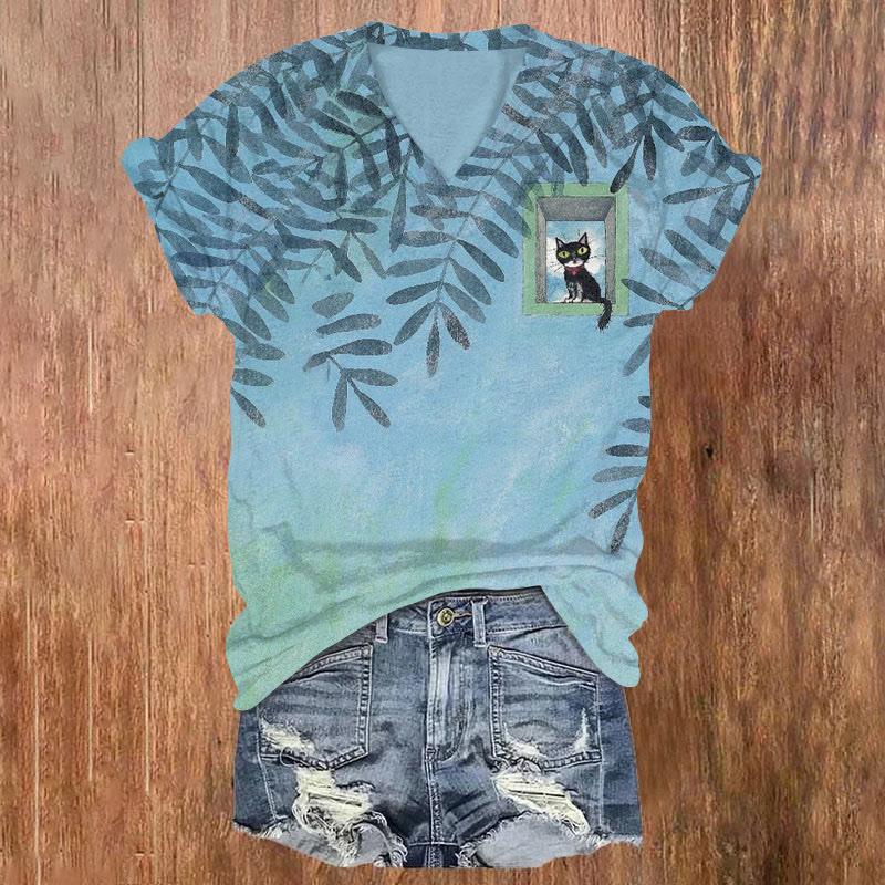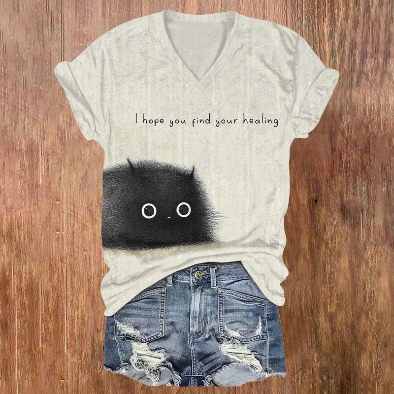 Dashingsoul I Hope You Find Your Healing Cat Print V-neck T-shirt