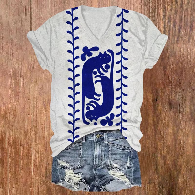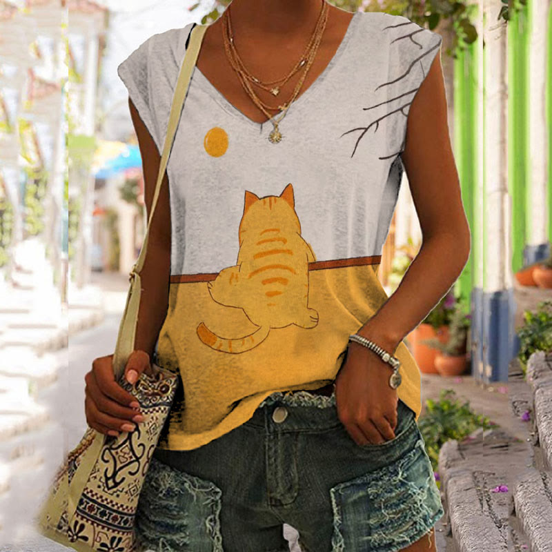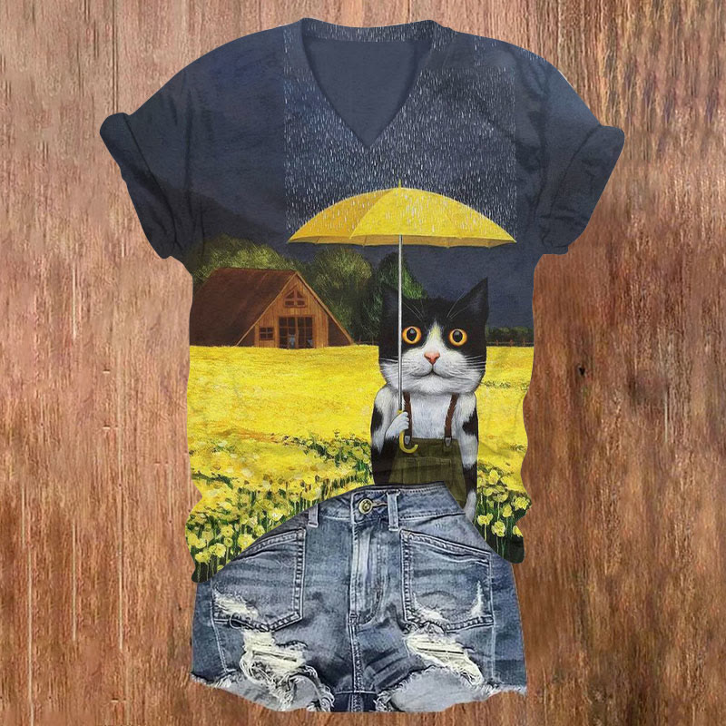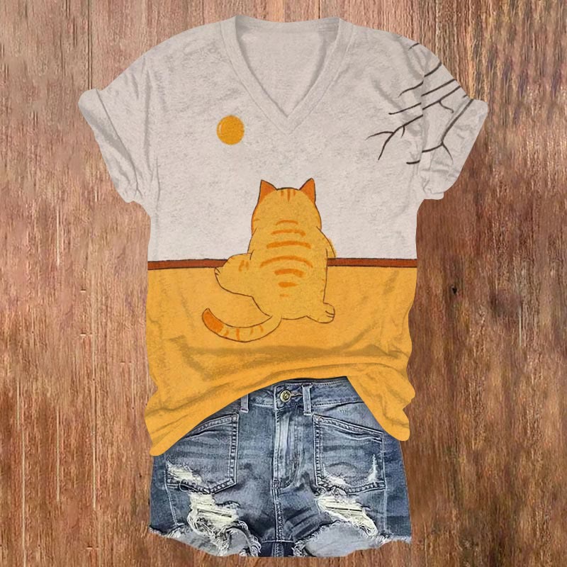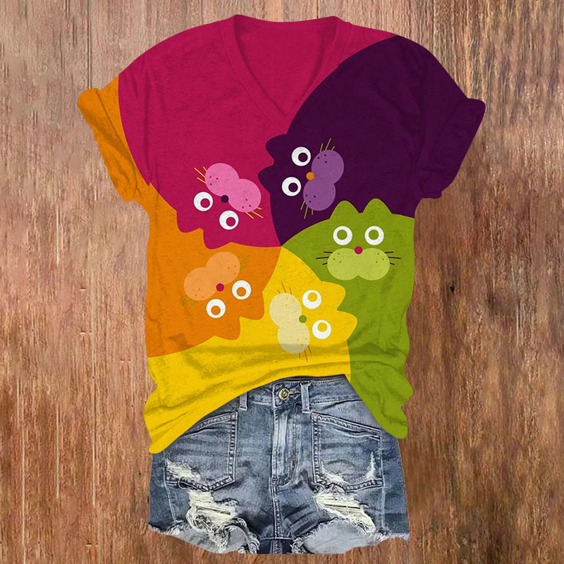 Dashingsoul Abstract Creative Cute Cat Print V-neck T-shirt