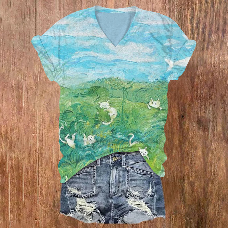 Dashingsoul White Cat In The Grassland Oil Painting Print V-neck T-shirt