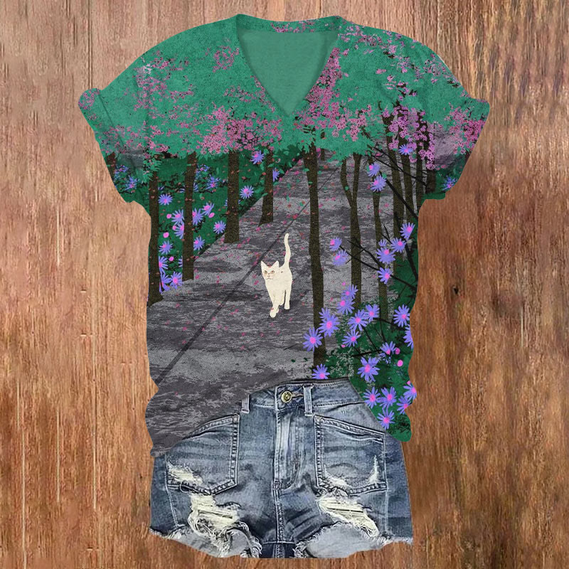 Dashingsoul Flower Cat Oil Painting Print V-neck T-shirt