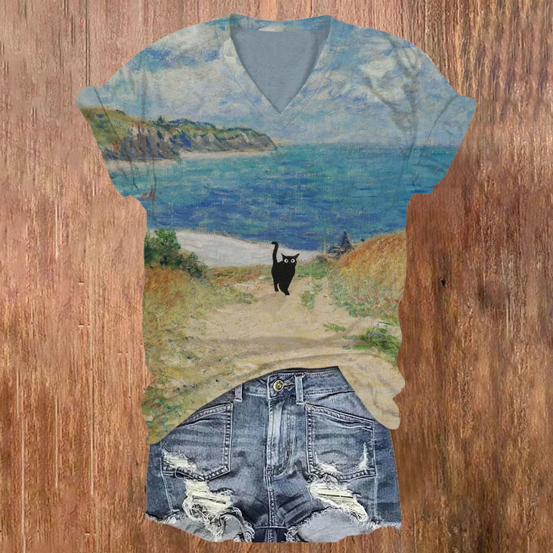 Dashingsoul Black Cat Walking On The Beach Oil Painting Print Short Sleeve V-neck T-shirt