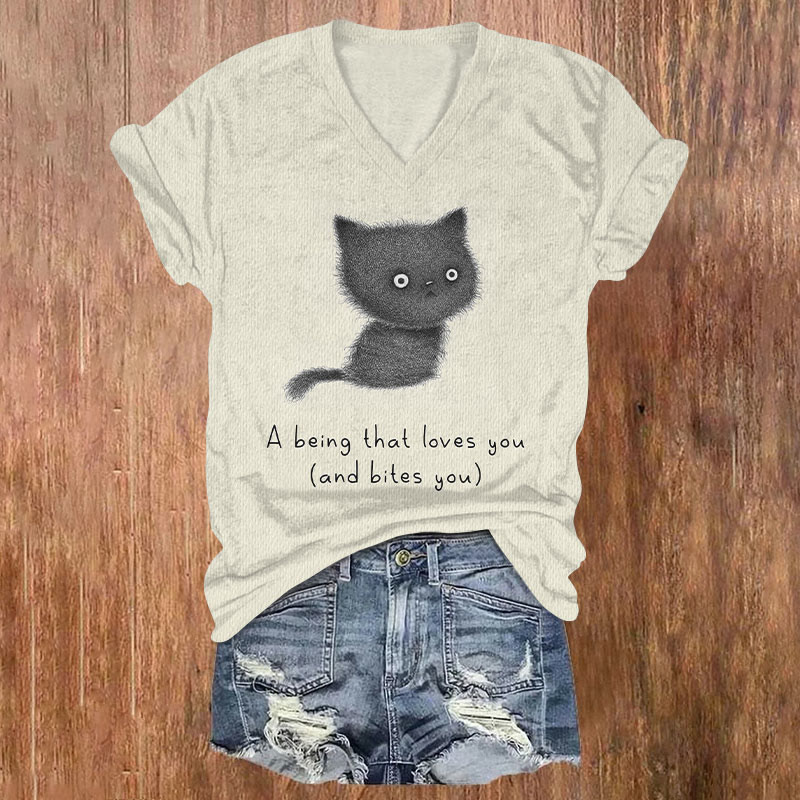 Dashingsoul A Being That Loves You(and Bites You) Cat Print V-neck T-shirt