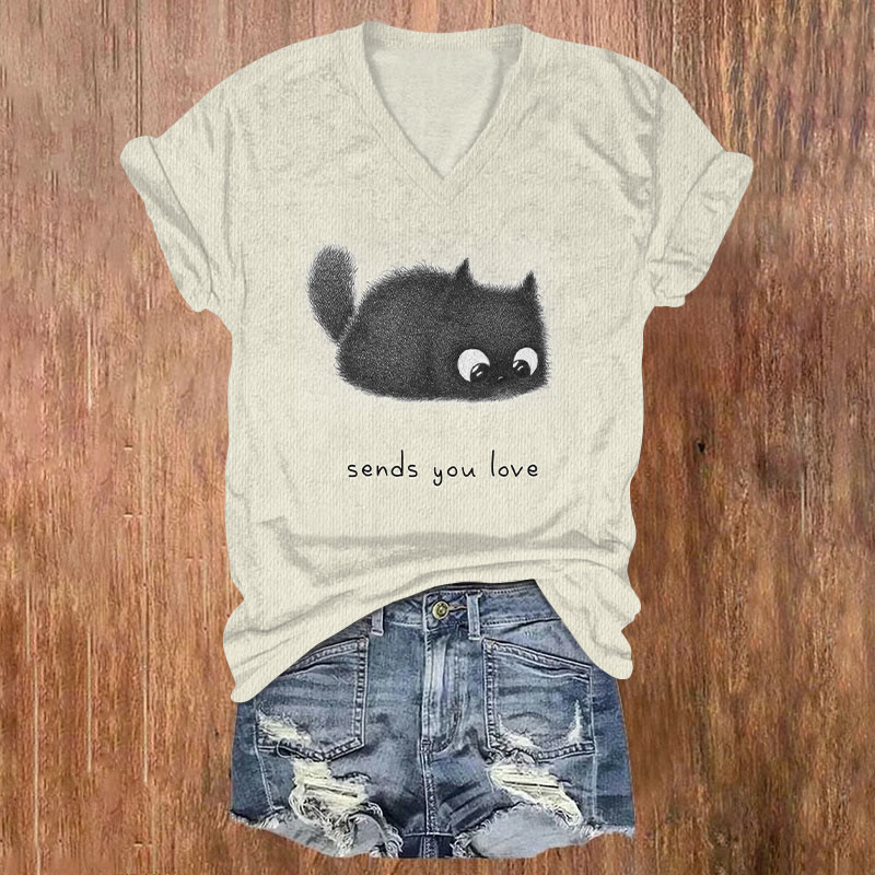 Dashingsoul Sends You Love Cat Print V-neck T-shirt