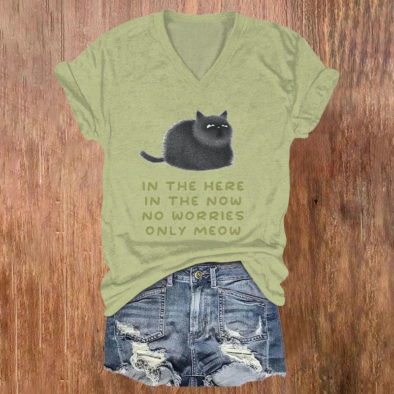 Dashingsoul In The Herein The Now No Worries Only Meow Cat Print V-neck T-shirt