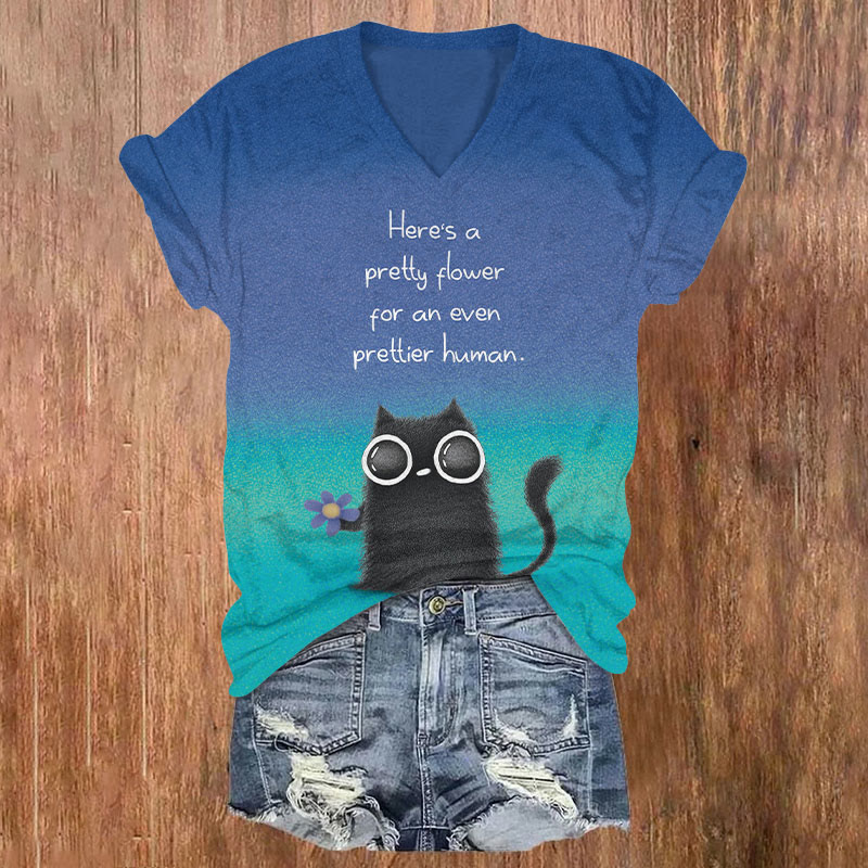Dashingsoul Here's Aprely Fower For An Even Preltier Human Cat Print V-neck T-shirt