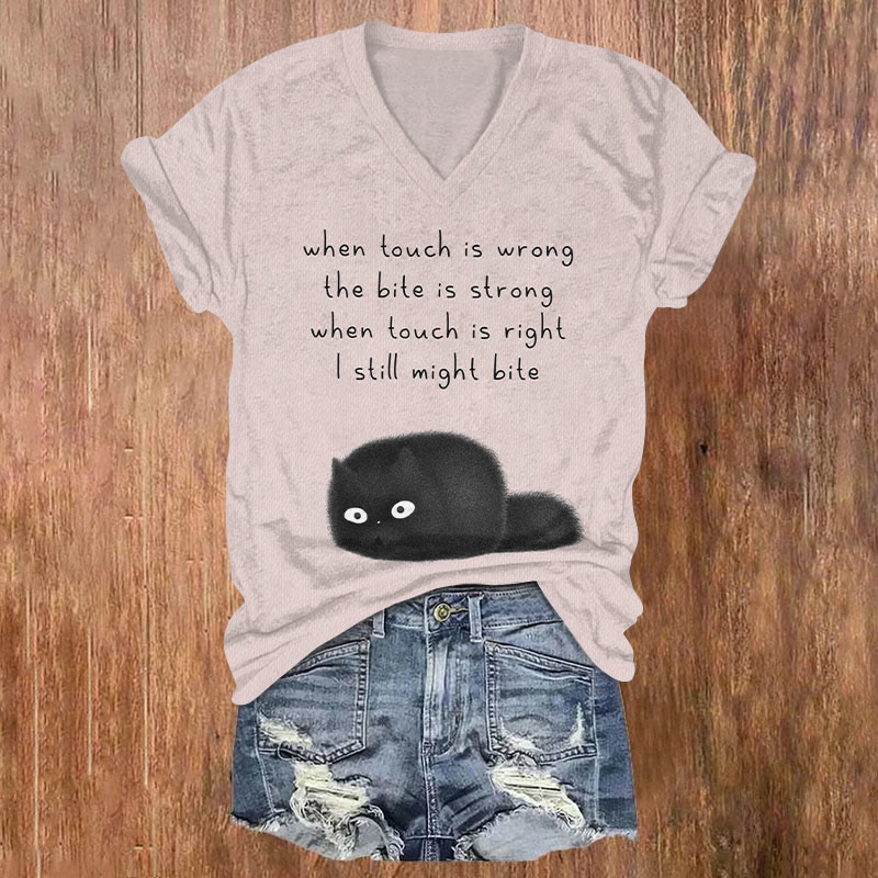Dashingsoul When Touch Is Wrong The Bite Is Strong Cat Print V-neck T-shirt