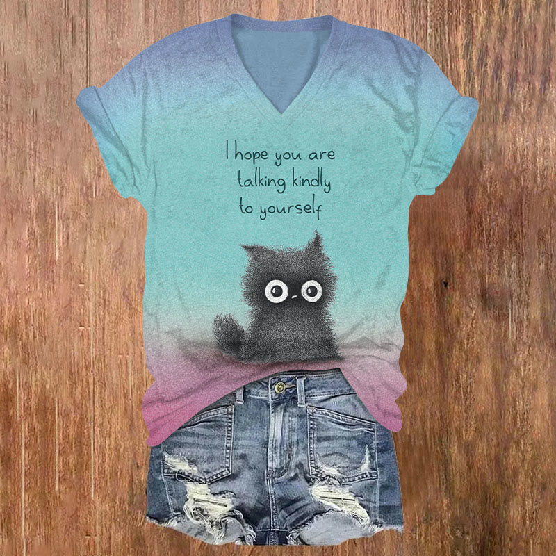 I Hope You Are Talking Kindly To Yourself Cat Print V-neck T-shirt