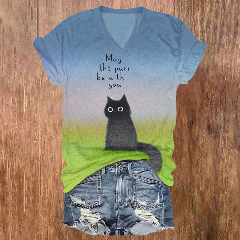 Dashingsoul May The Purr Be With You Cat Print V-neck T-shirt