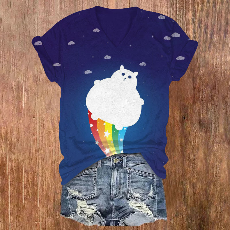 Dashingsoul Cute Rainbow Cat Cloud Print V-neck T-shirt