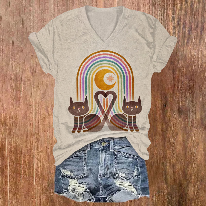 Dashingsoul Retro Rainbow Cat Print V-neck T-shirt