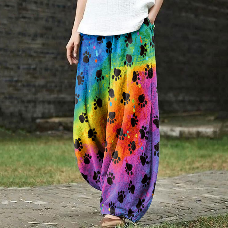 Dashingsoul Meow Tie-dye Rainbow Paws Print Casual Pants
