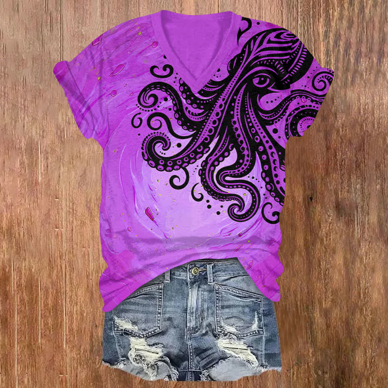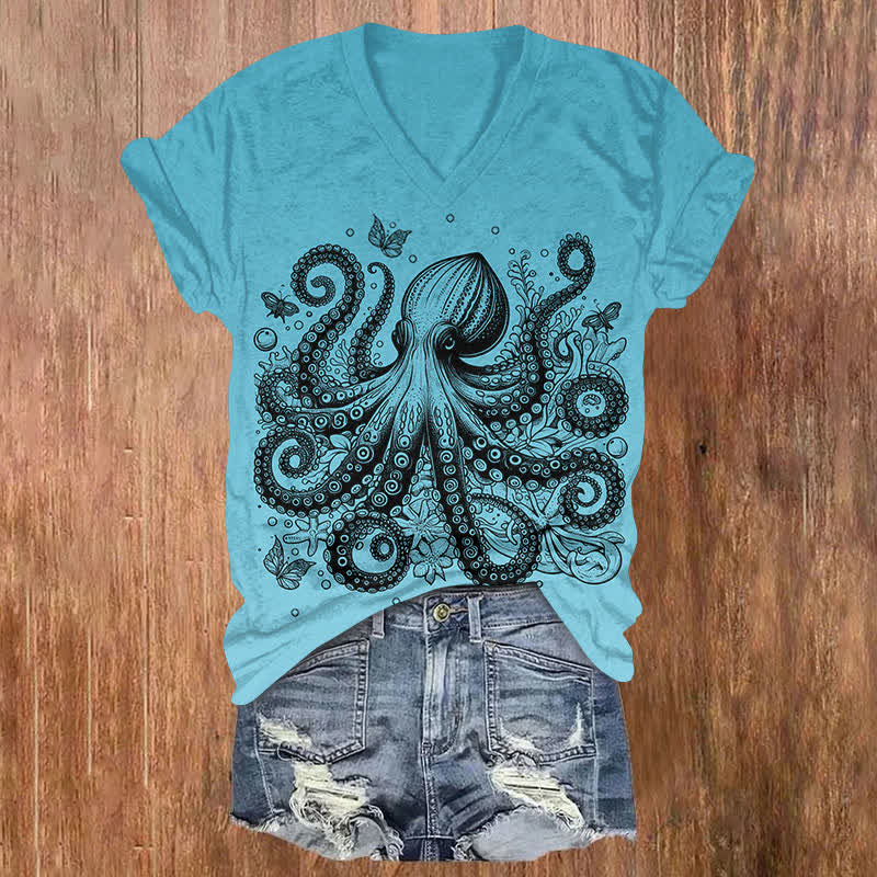 Vintage Wise Ocean Octopus Print V-neck T-shirt