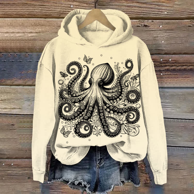 Vintage Wise Ocean Octopus Print Long Sleeve Hoodie