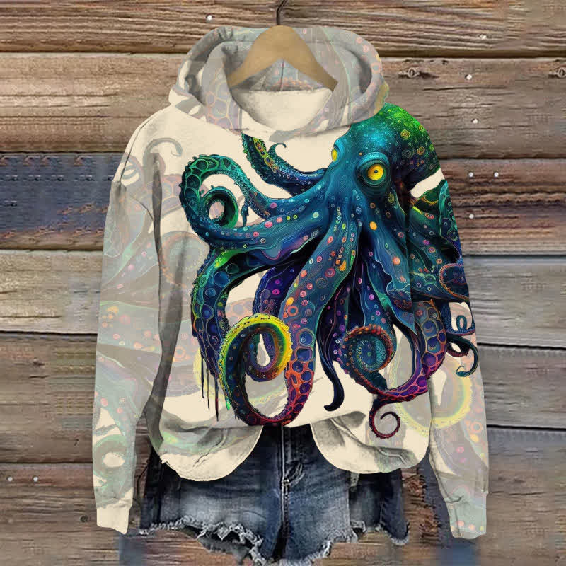 Vintage Colorful Shocking Octopus Print Long Sleeve Hoodie