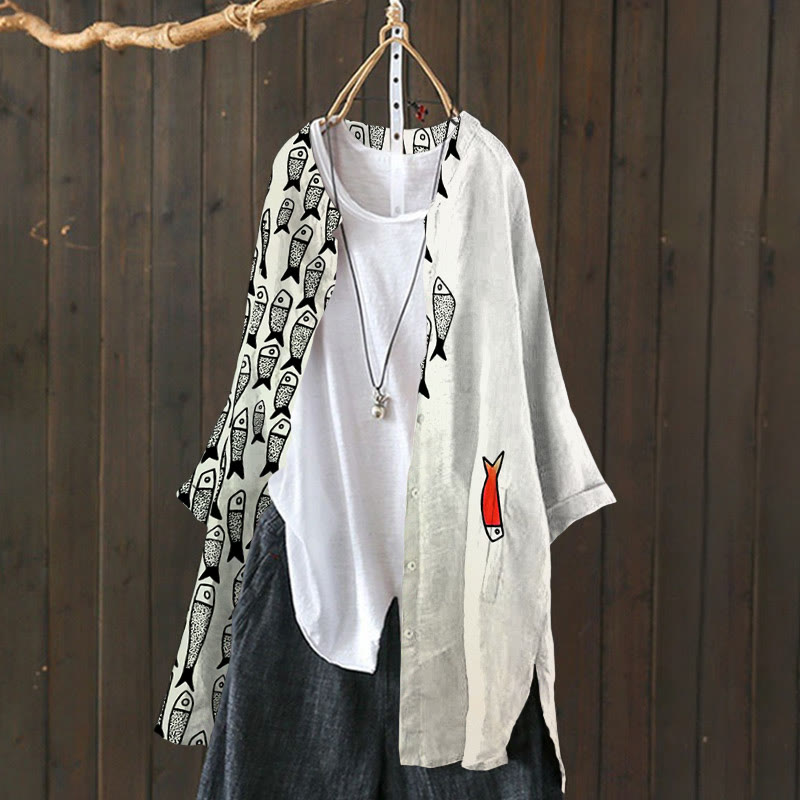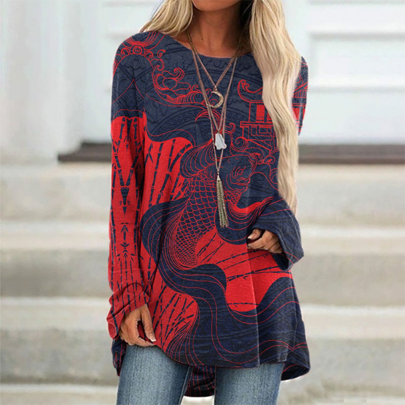 Dashingsoul Antique Abstract Art Koi Fish Print Long-sleeved Tunic